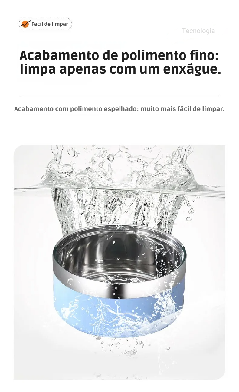🧼 Higiene Superior (Saúde em Primeiro Lugar): Diferente do plástico, o aço inox não possui porosidade. Isso impede o acúmulo de fungos e bactérias, sendo a escolha ideal para prevenir a acne felina e irritações na pele dos pets.